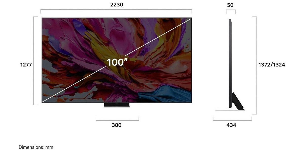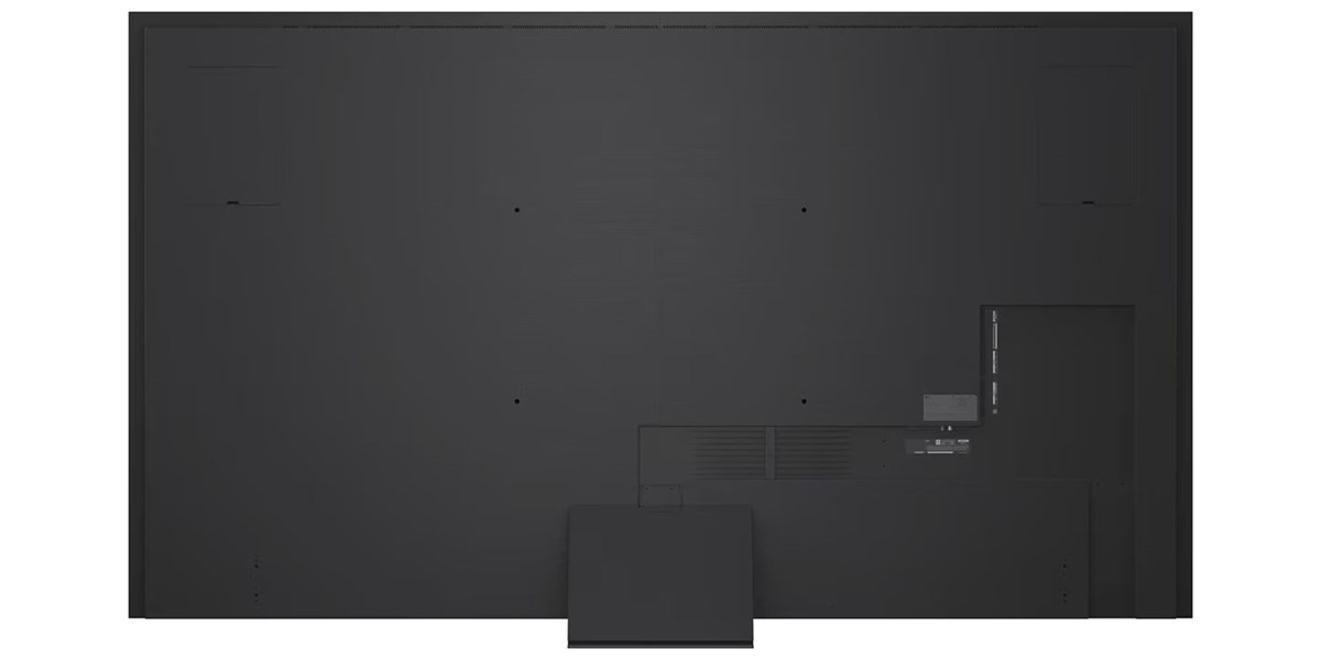 Le LG 100QNED86A affiche une finesse de seulement 49,9 mm sans pied. Le pied central est ajustable en hauteur pour intégrer une barre de son. Il peut aussi être fixé au mur via VESA 600 x 400.