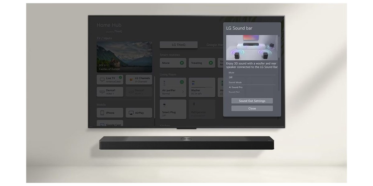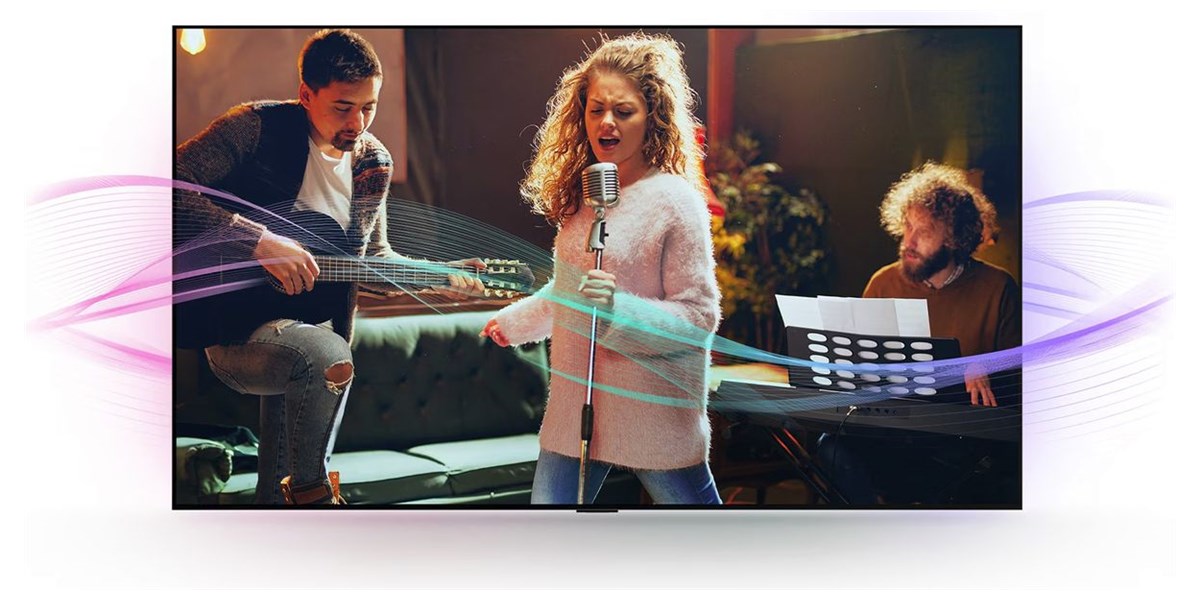 Avec ses haut-parleurs 2.2 (40 W) et AI Sound Pro, le son est spatial, clair et immersif. Le téléviseur est compatible Dolby Atmos et WOW Orchestra, synchronisant l’audio avec une barre de son LG pour une scène sonore amplifiée.