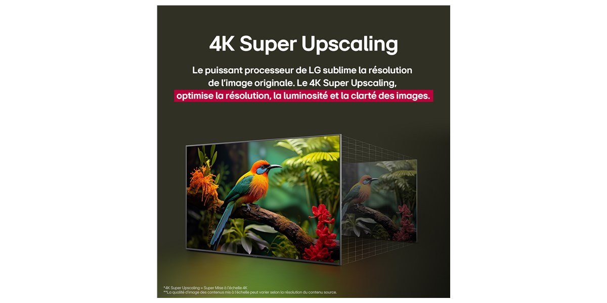 Ce modèle propose une puissance sonore de 20 W avec diffusion stéréo 2.0, optimisée par l’AI Sound Pro. Cette technologie recrée un son virtuel en 9.1.2 canaux pour une ambiance cinéma dans votre salon. Les dialogues sont clarifiés par l’AI Clear Sound, tandis que la compatibilité Bluetooth Surround permet d’ajouter facilement des enceintes. Le système WOW Orchestra permet quant à lui de synchroniser la TV avec une barre de son LG pour une restitution encore plus riche et cohérente.
