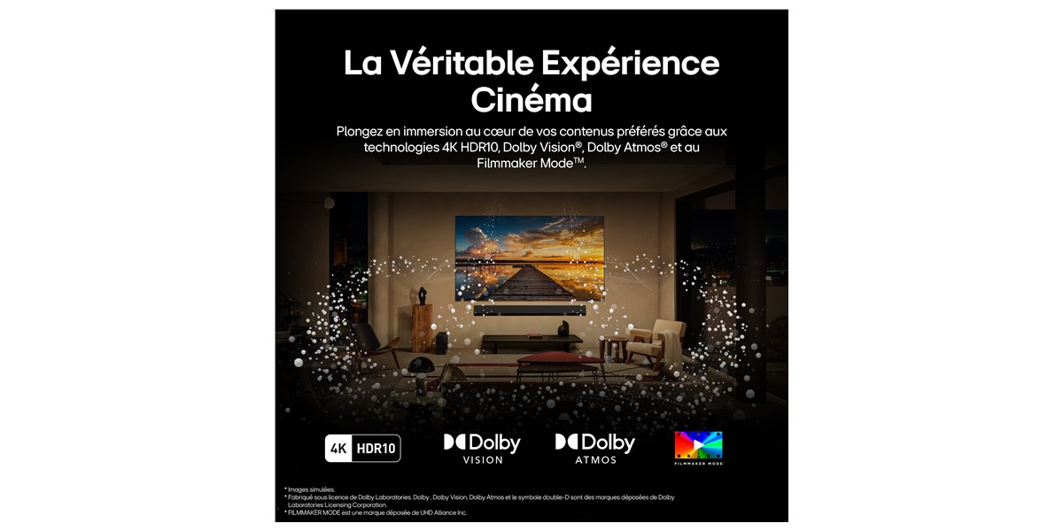 Le système audio 2.2 canaux de 40W, incluant un caisson de basses intégré, est optimisé par AI Sound Pro avec virtualisation 11.1.2. En complément, les technologies Dolby Atmos et DTS:X enrichissent l’espace sonore pour une immersion totale.
