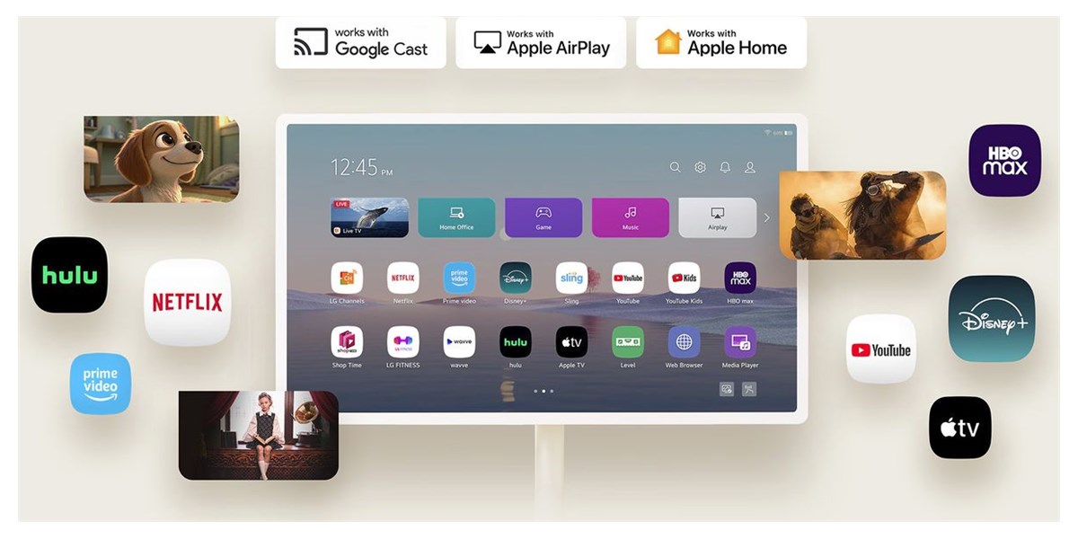 Le LG StanbyME 2 est prêt pour le divertissement connecté. Il intègre les principales plateformes de streaming (Netflix, Disney+, Prime Video, CANAL+, YouTube, LG Channels et plus encore) ainsi que des services de cloud gaming comme Xbox Cloud Gaming, Amazon Luna ou GeForce Now, transformant l’écran en véritable hub de loisirs sans nécessiter de console ou décodeur additionnel. La compatibilité Apple AirPlay 2, Google Cast et le support Matter facilitent le partage de contenu depuis smartphones, tablettes ou ordinateurs. La connectique HDMI eARC permet de relier une source externe ou une barre de son, tandis que le port USB-C DP Alt Mode offre une connexion directe à un PC portable ou à des appareils mobiles, idéale pour le télétravail et les présentations.