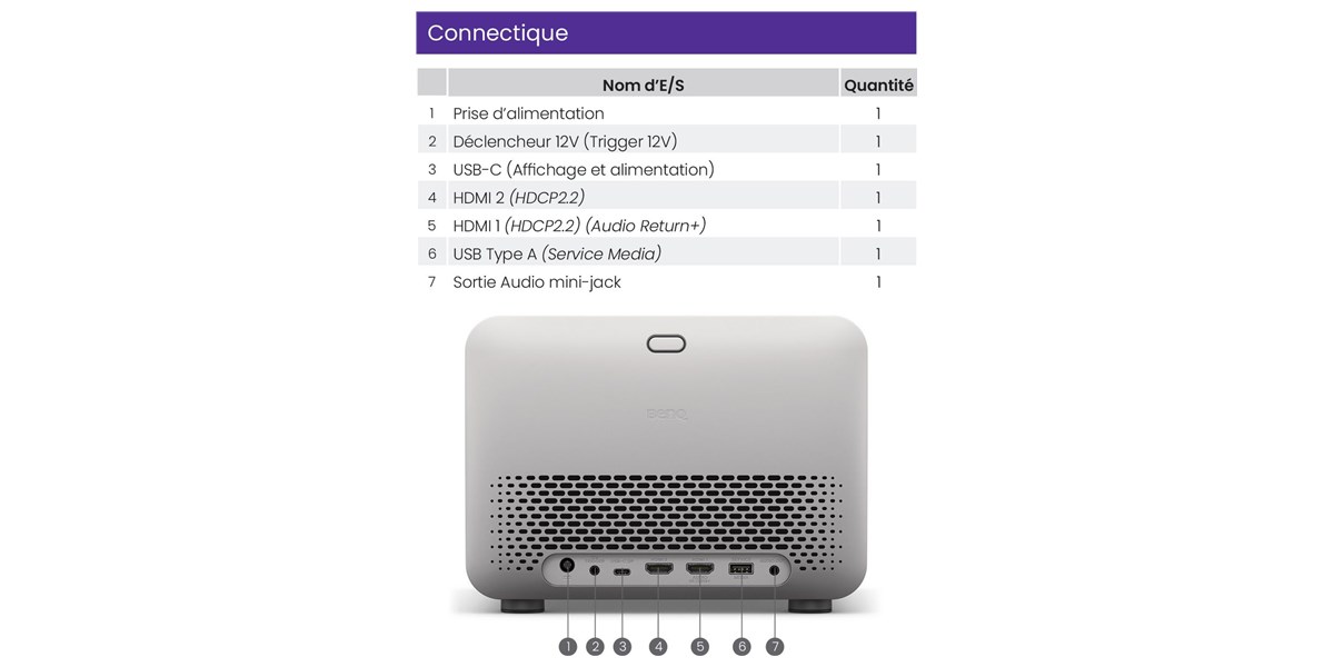 Le TK705STi dispose de deux ports HDMI 2.1 (dont un eARC), d’un port USB-C avec alimentation, d’un port USB-A et d’une sortie audio mini-jack. Il permet de connecter et alimenter directement vos appareils, pour une installation simple, propre et efficace.