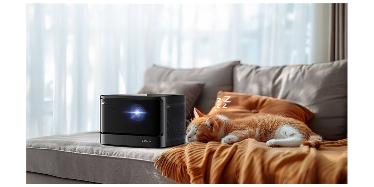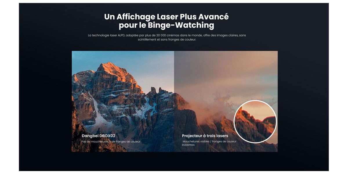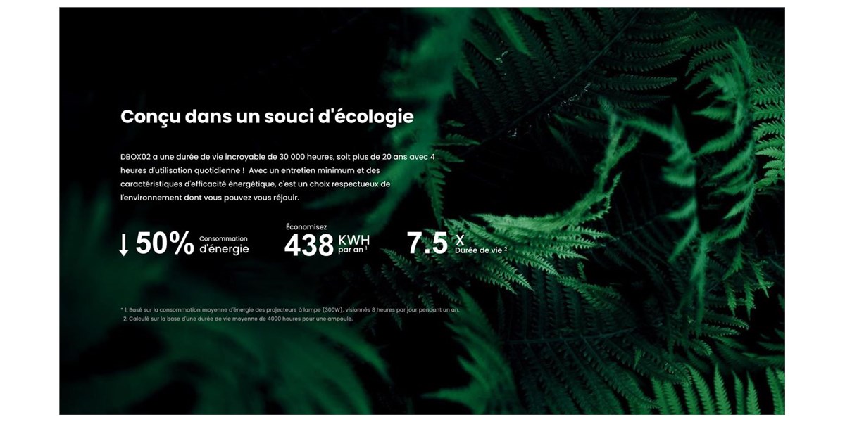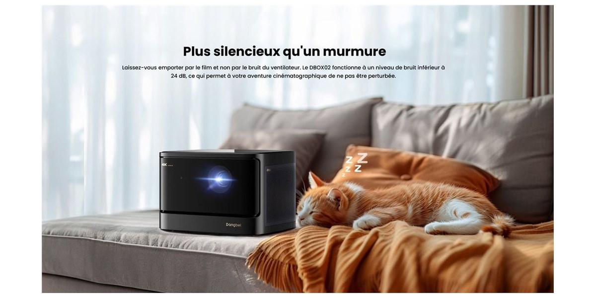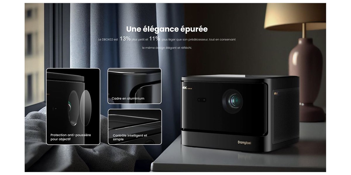 Châssis aluminium (236 × 201,5 × 167 mm, 3,98 kg) à la finition soignée, mieux protégé contre la poussière. Le refroidissement silencieux (< 24 dB) préserve l’immersion, la source laser dure jusqu’à 30 000 heures.