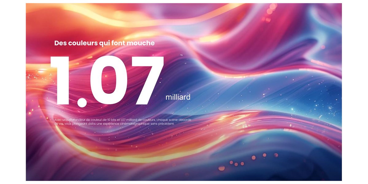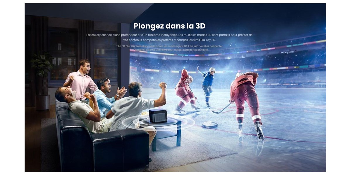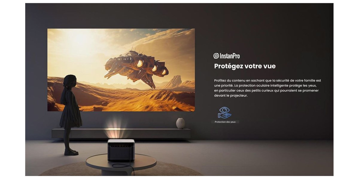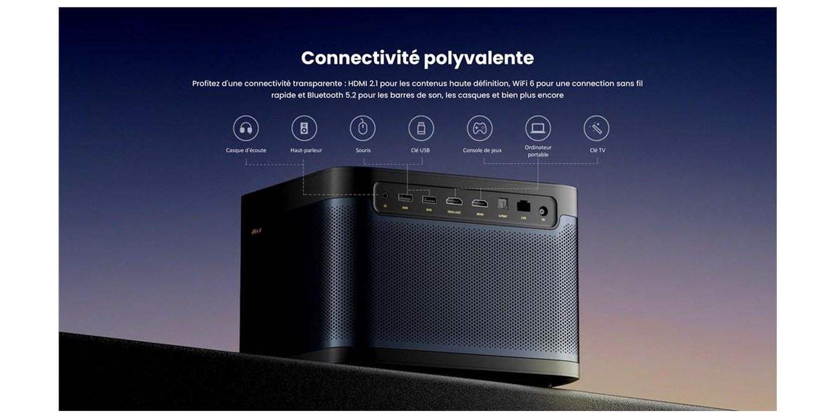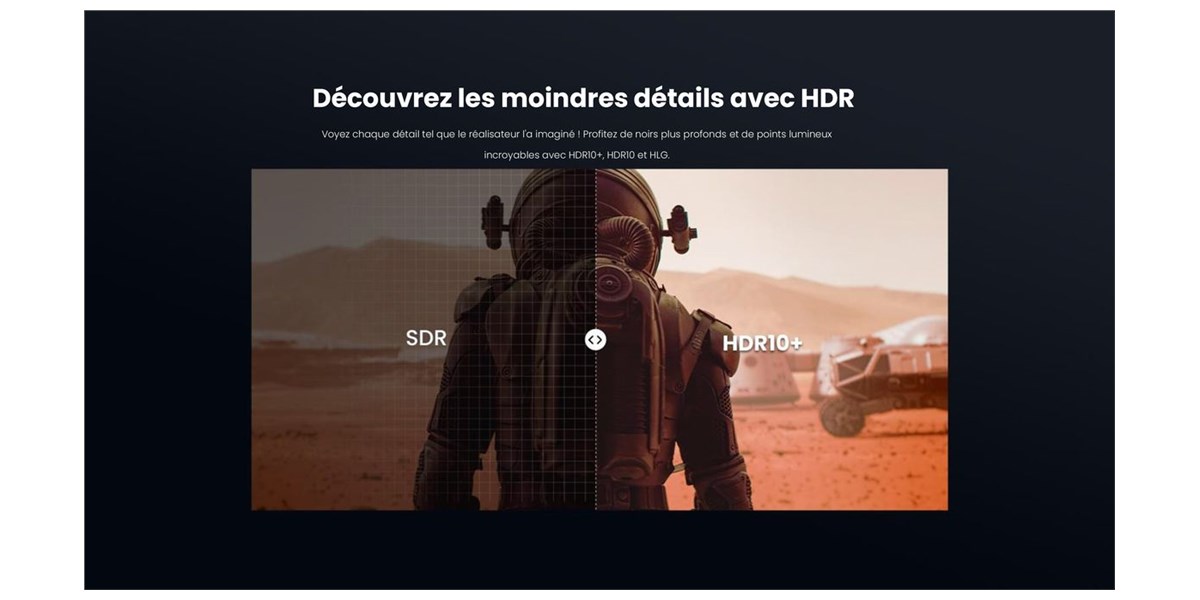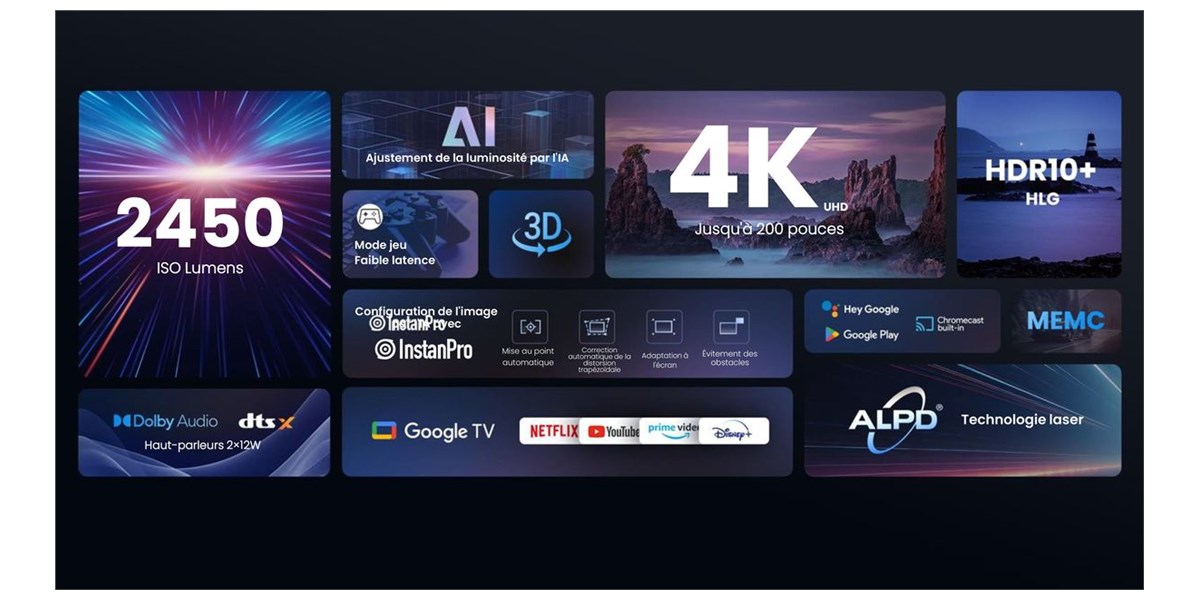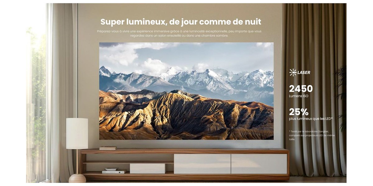 La puce DLP 0,47" UHD DMD affiche 3840 × 2160 pixels avec une grande finesse, même sur grand écran. Les 2450 lumens ISO assurent une excellente lisibilité dans un salon maîtrisé, et la profondeur de couleur 10 bits, couplée au HDR10+, renforce nuances et contrastes pour un rendu cinéma.