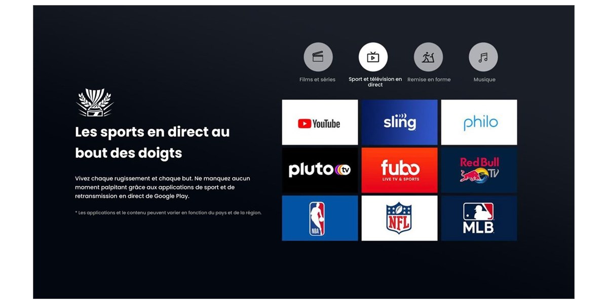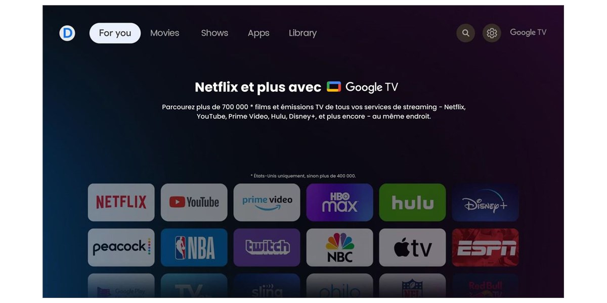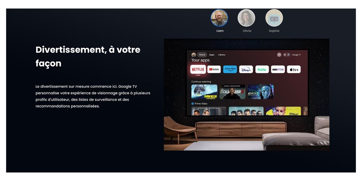 Google TV donne accès à Netflix, YouTube, Prime Video, Disney+ et plus encore, avec recherche vocale via Google Assistant. Chromecast intégré et AirScreen facilitent le cast depuis smartphone ou ordinateur.