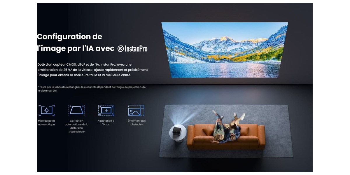 L’autofocus dToF + caméra ajuste la netteté instantanément. La correction trapézoïdale automatique ±30°, l’adaptation à l’écran et l’évitement des obstacles cadrent l’image proprement. Le zoom 100–50 % et le ratio de projection 1,27:1 facilitent l’obtention de 60" à 200" selon le recul.