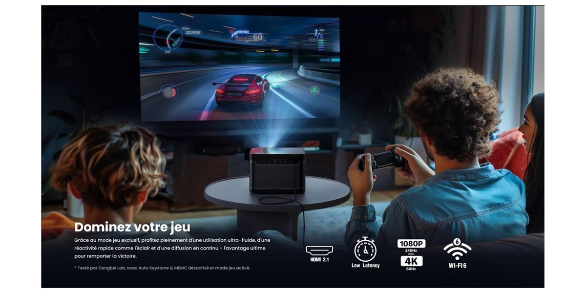 Pensé pour le home cinéma moderne, le Dangbei Mars Pro 2 combine une source laser ALPD ultralumineuse (2450 lumens ISO) à une projection 4K UHD pour offrir une image nette et contrastée jusqu’à 200 pouces. Compatible HDR10+/HDR10/HLG, doté d’un autofocus dToF, d’un zoom 100–50 % et d’une correction trapézoïdale automatique, il s’installe en un clin d’œil. Google TV (avec Netflix sous licence) simplifie l’accès à vos contenus, tandis que le mode jeu à faible latence et la connectique HDMI 2.1/eARC assurent performances et évolutivité.