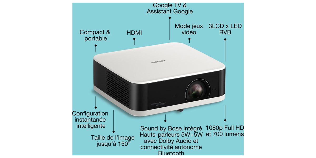 Le vidéoprojecteur Epson EF-61W Lifestudio est un modèle portable pensé pour offrir une expérience de projection complète et immersive, à la maison comme en déplacement. Grâce à sa technologie 3LCD combinée à une source lumineuse LED RGB, il délivre des couleurs éclatantes en Full HD sur une image pouvant atteindre 150 pouces. Sa compacité, son système audio Bose intégré, et son interface Google TV le rendent particulièrement simple à utiliser au quotidien.