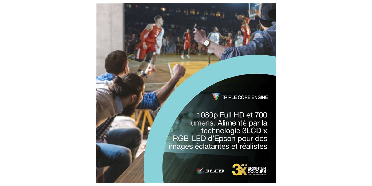 La combinaison de la technologie 3LCD et de la source lumineuse LED RGB assure une reproduction fidèle et intense des couleurs. L’image est fluide, sans arc-en-ciel, et riche en détails, grâce à un traitement vidéo 10 bits. Avec une luminosité de 700 lumens ANSI et un taux de contraste de 5 000 000:1, ce modèle s’adapte aux environnements semi-sombres pour un rendu optimal, que ce soit pour les films, séries ou jeux.