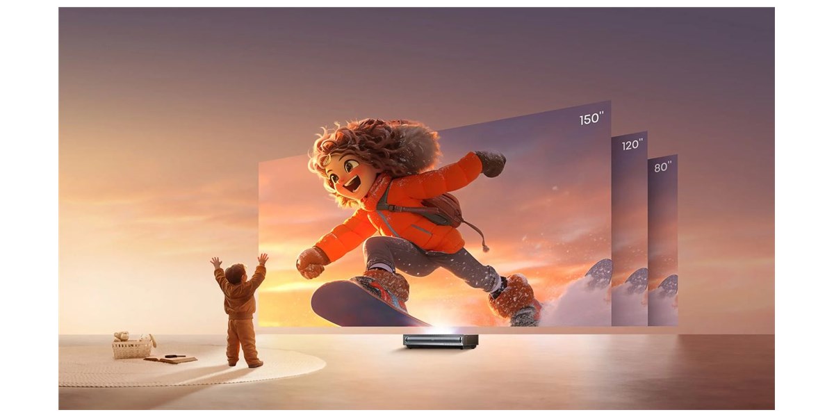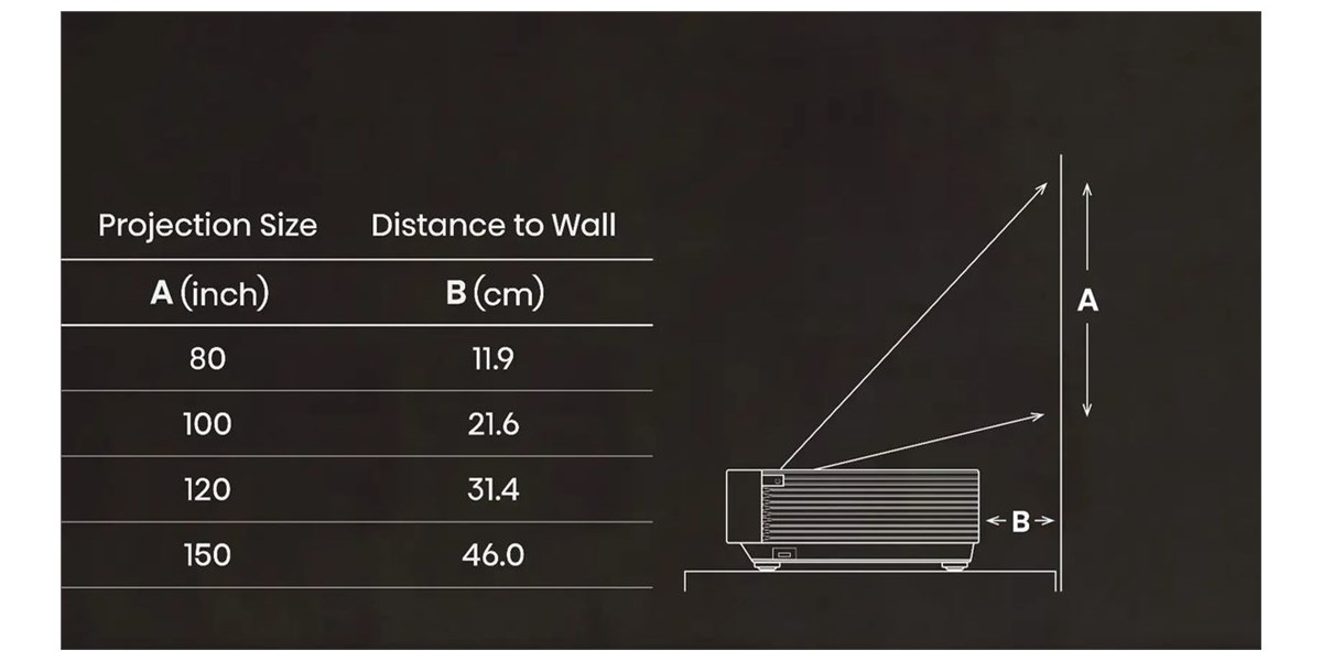Le rapport de projection de 0,22:1 permet au PX3 d’afficher une image de 80 à 150 pouces à seulement quelques dizaines de centimètres du mur. Cette configuration rend l’appareil idéal pour les salons ou chambres de taille moyenne, en évitant les contraintes d'installation complexes. Il s’adapte aisément à l’environnement grâce à une correction géométrique sur 9 points.