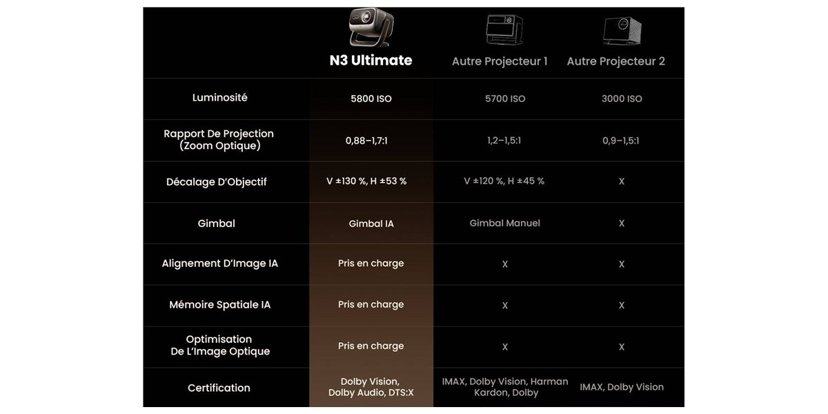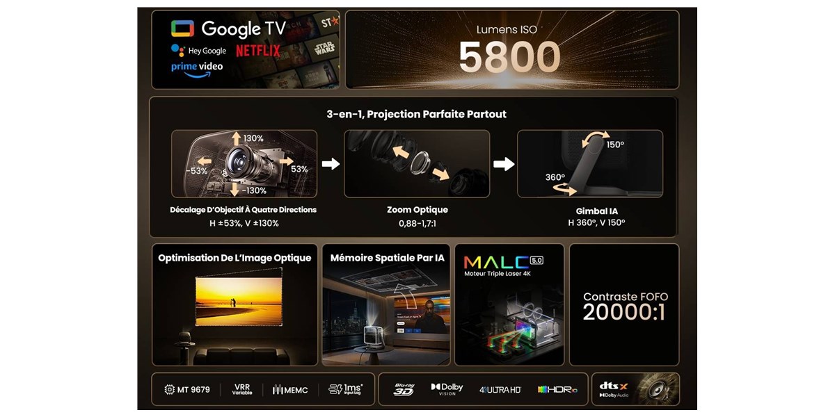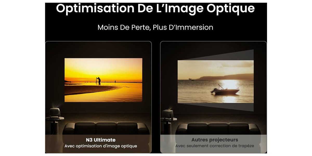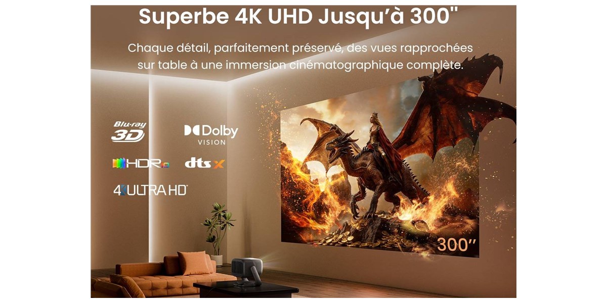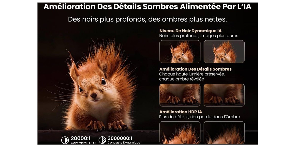 Le contraste élevé permet de distinguer clairement les zones sombres et lumineuses, apportant profondeur et relief à l’image. Les scènes gagnent en intensité, notamment dans les environnements nocturnes ou faiblement éclairés. L’intégration de technologies d’optimisation par intelligence artificielle améliore encore la qualité d’affichage. Le traitement dynamique ajuste les paramètres en temps réel pour offrir une image toujours équilibrée. Les ???ails dans les zones sombres sont renforcés, ce qui améliore la lisibilité globale des contenus. Cette gestion intelligente garantit une expérience visuelle homogène, quelles que soient les conditions de projection.