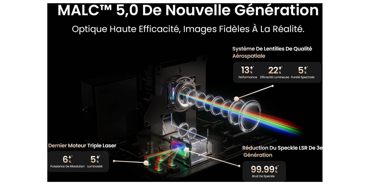 La technologie triple laser 5.0 utilisée permet d’obtenir une luminosité très élevée, idéale pour une utilisation dans des environnements variés. L’image conserve une excellente lisibilité même en présence de lumière ambiante, ce qui améliore considérablement le confort d’utilisation. La définition 4K Ultra HD assure une finesse exceptionnelle, avec des détails précis et une netteté constante sur toute la surface de projection. La couverture étendue de l’espace colorimétrique BT.2020 permet de restituer des couleurs riches et naturelles. Chaque nuance est reproduite avec précision, ce qui renforce le réalisme des contenus. Cette qualité visuelle est particulièrement appréciable pour les films, les séries et les événements sportifs.