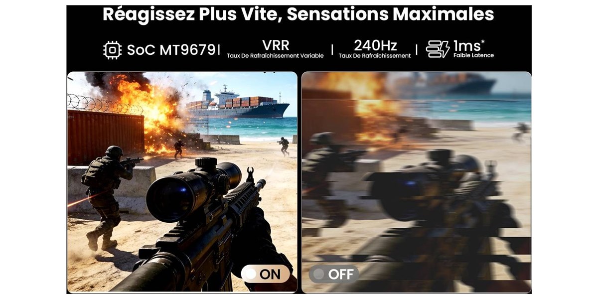Les performances dédiées au jeu vidéo permettent de profiter d’une fluidité exceptionnelle. Le taux de rafraîchissement élevé assure des mouvements nets et sans saccades. La compatibilité VRR synchronise l’affichage avec la source pour éviter les déchirures d’image. Cette technologie améliore la stabilité visuelle lors des sessions de jeu. La latence extrêmement faible garantit une réactivité immédiate, essentielle pour les jeux compétitifs. L’ensemble de ces caractéristiques offre une immersion totale sur grand écran.