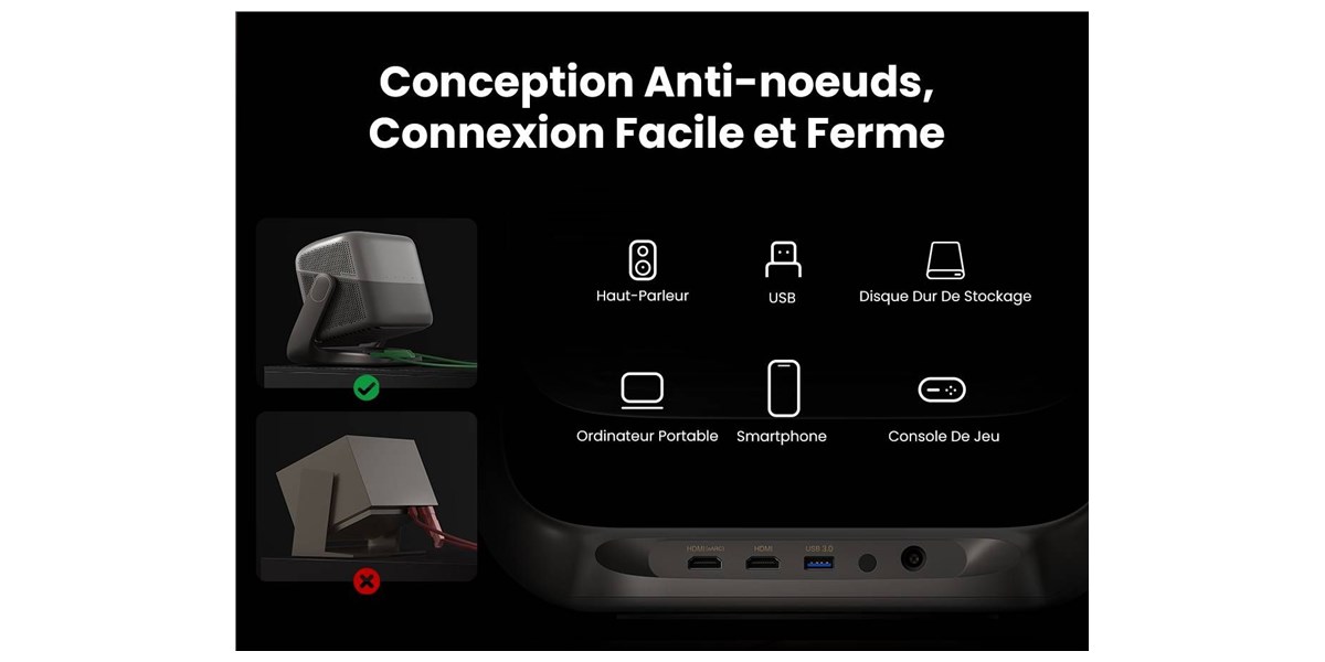 Les haut-parleurs intégrés délivrent un son ample et équilibré. La restitution couvre efficacement les basses fréquences, ce qui enrichit l’expérience sonore. Cette configuration permet une utilisation autonome sans équipement audio externe. Le rendu sonore accompagne parfaitement les contenus vidéo. L’utilisateur peut ainsi profiter d’une solution complète combinant image et son dans un seul appareil.