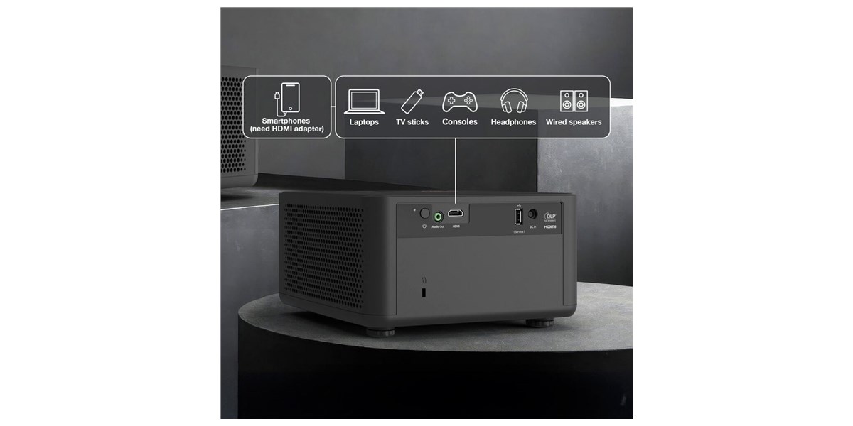 L’entrée HDMI 1.4a permet de connecter tous vos appareils : lecteur Blu-ray, console, PC ou box TV. Il intègre également une sortie audio jack 3,5 mm pour un système sonore externe, et un port USB-A 2A pour alimenter un dongle HDMI type Chromecast ou Fire TV Stick.