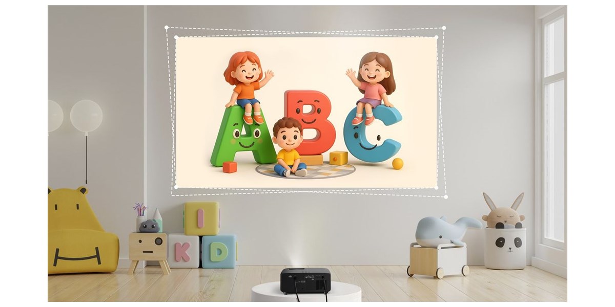 Le zoom manuel 1,3x et le rapport de projection compris entre 1,21:1 et 1,59:1 facilitent l’adaptation à différentes tailles de pièce. La distance de projection s’étend de 1 à 8 mètres, pour une diagonale allant de 28 à 300 pouces. La correction trapézoïdale horizontale et verticale de ±30°, associée à une correction automatique verticale, simplifie l’alignement de l’image. La projection 360° permet une installation murale, plafond ou configuration spécifique selon les besoins.