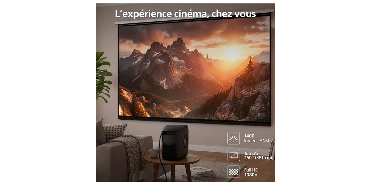 Avec sa résolution native de 1920 × 1080 pixels, ce projecteur garantit un affichage en Full HD sans compression. L’image projetée est nette, avec des contours bien définis, idéale pour les films, les séries, les jeux ou même les présentations professionnelles. Son ratio de projection de 1,2:1 permet une image allant jusqu’à 150 pouces, immersive à souhait.