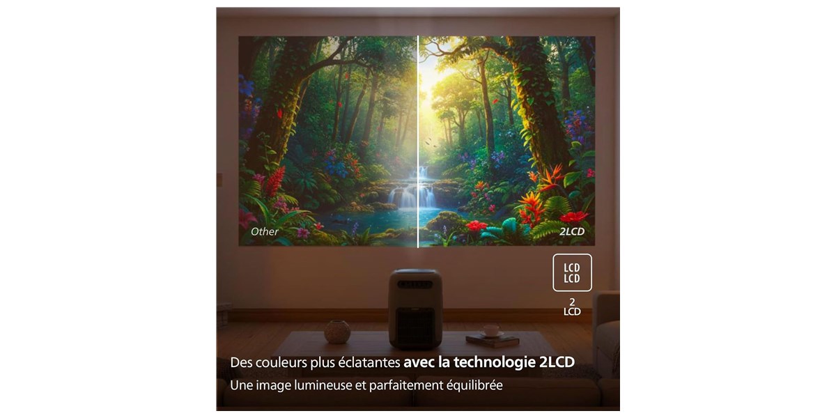 Le Philips NeoPix 950 Smart repose sur une technologie d’affichage 2LCD qui superpose deux panneaux LCD, offrant une luminosité optimale de 1400 lumens ANSI. Cette combinaison permet d’obtenir une image claire et colorée, même dans des environnements modérément éclairés, et assure une restitution plus riche que les vidéoprojecteurs LCD classiques.