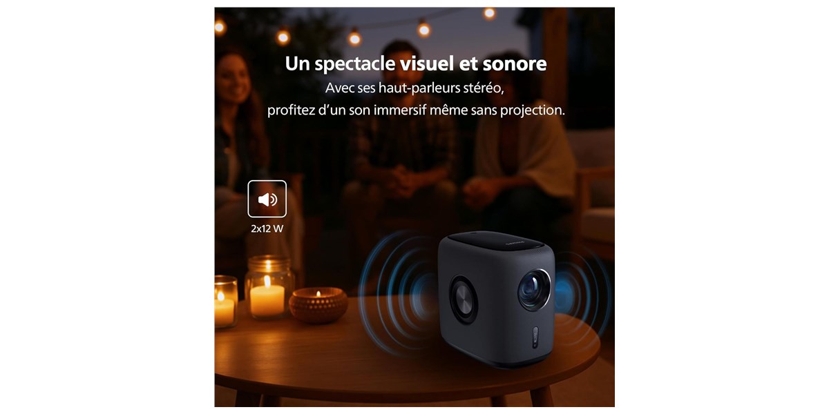 Deux haut-parleurs de 12 W intégrés délivrent une puissance sonore inhabituelle pour un projecteur. Le rendu est dynamique, avec des basses bien présentes et une clarté vocale excellente. Ce système sonore rend inutile l’ajout d’enceintes externes dans un usage classique, tout en laissant la possibilité de connecter un système audio via Bluetooth ou jack.