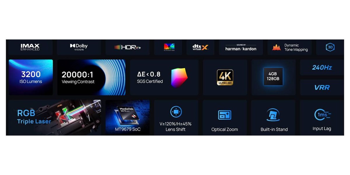 Compatible HDR10+, Dolby Vision, IMAX Enhanced et Filmmaker Mode, le Horizon 20 respecte la vision des réalisateurs, offrant une reproduction fidèle des œuvres. Avec une taille d’image pouvant atteindre 300 pouces, il transforme n’importe quel mur en véritable écran de cinéma.