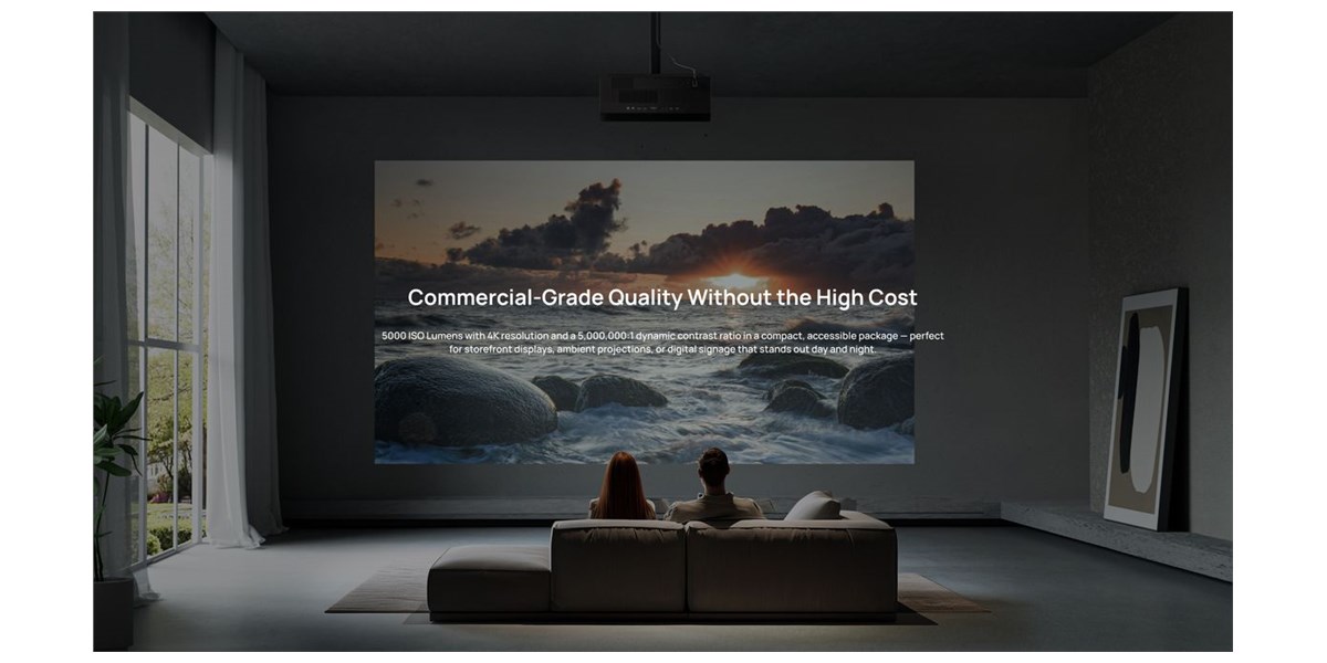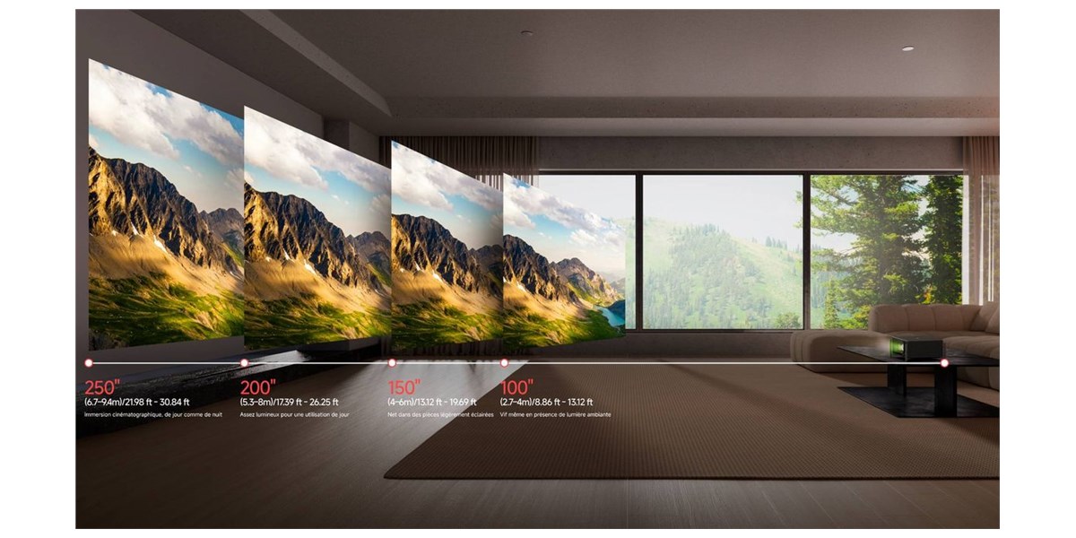 Le zoom optique 1.2x et le lens shift motorisé (V±100 %, H±40 %) offrent un positionnement libre sans distorsion. Que ce soit sur meuble ou au plafond, l’ajustement de l’image est rapide et précis. Les pieds métalliques amovibles renforcent cette polyvalence, permettant une installation parfaitement adaptée à l’espace disponible.