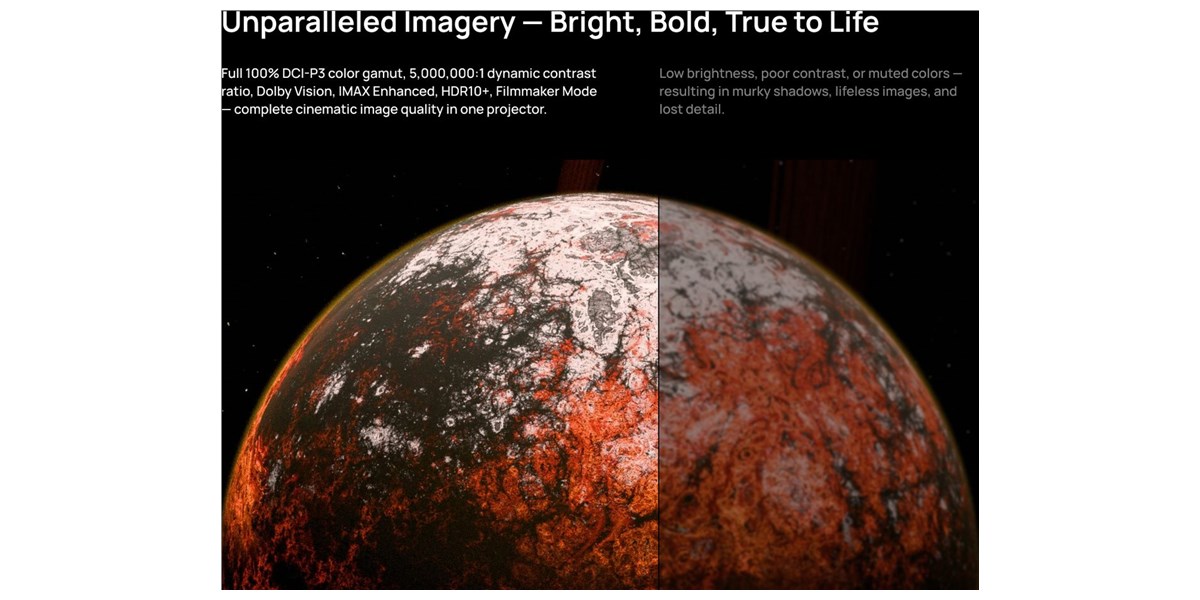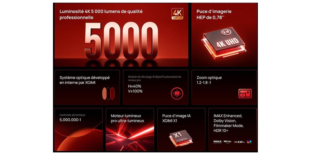 Le Xgimi Titan est compatible avec les formats HDR les plus exigeants : HDR10+, Dolby Vision, HLG, IMAX Enhanced et Filmmaker Mode. Ces technologies assurent un rendu d’image fidèle à la vision des réalisateurs, en renforçant les contrastes et en optimisant le rendu lumineux.